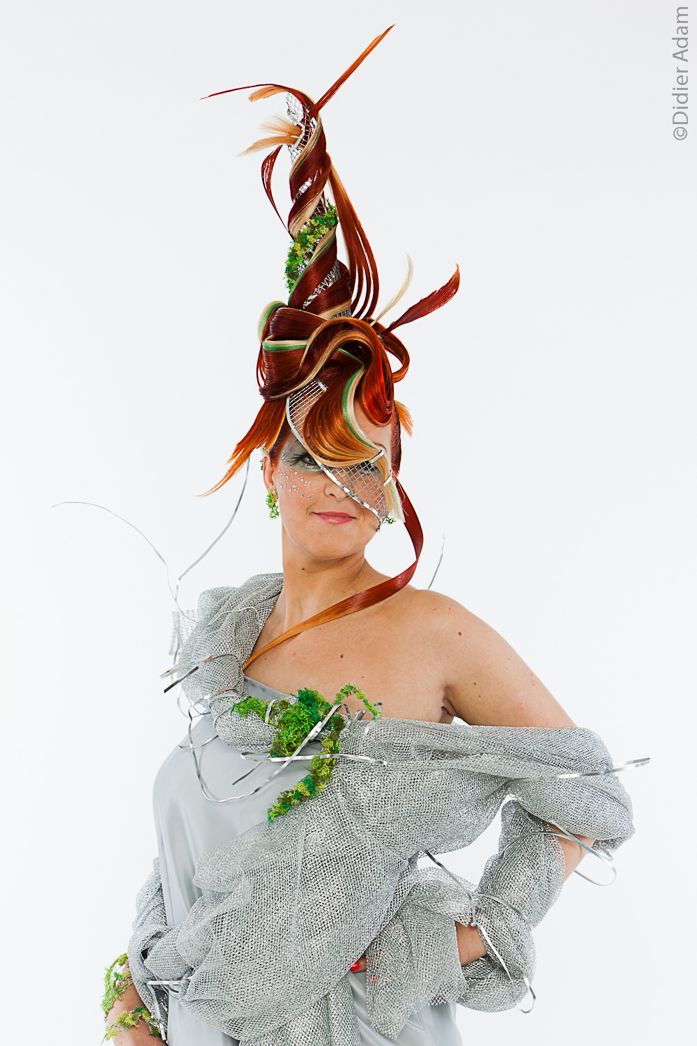 Adeline Monier : Pour être honnête j’ai trouvé mon inspiration en cherchant sur internet des architectures futuristes. Le pont de Dubaï me semblait adapté, avec sa structure semi aérienne, et ses volumes assez impressionnants. L’architecture ne faisait pas bloc, elle a des lignes douces, pas raides qui me faisaient penser à des cheveux. J’ai travaillé avec des postiches, en insérant beaucoup de végétal, coloré et décoloré, le tout intégré dans une structure en grillage. Lors de la série à la Sorbonne, je me suis sentie honorée, ma maman était très fière de moi. Je suivais la lignée familiale. J’ai travaillé très très durement pour suivre ses traces.