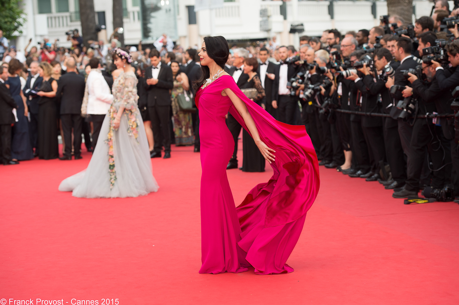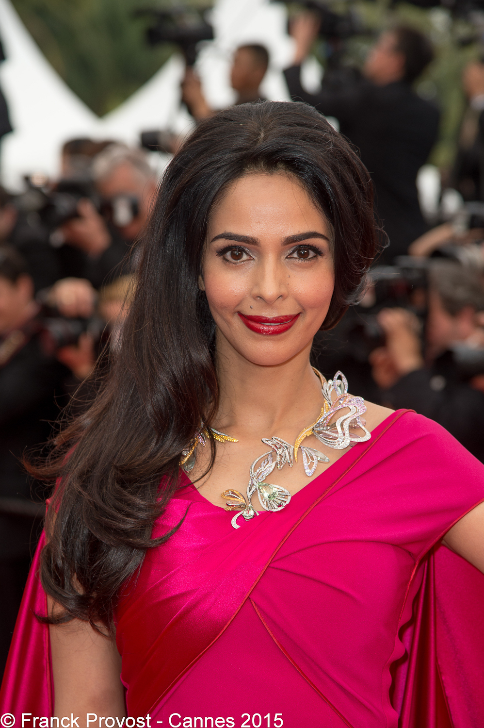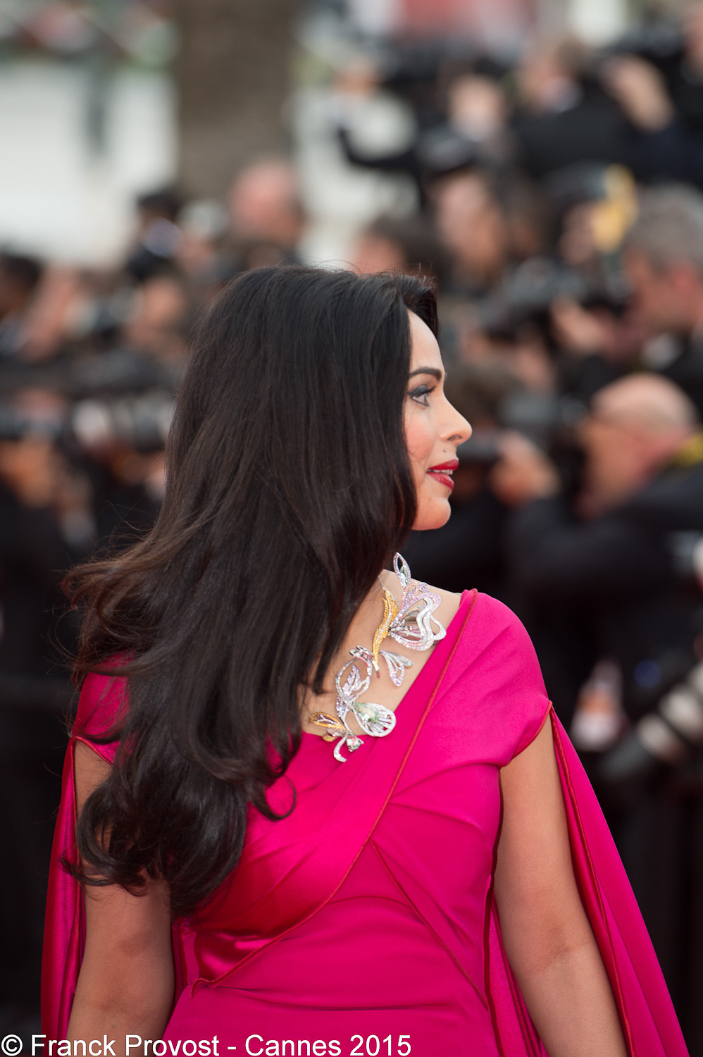 L’actrice indienne Mallika Sherawat présente pour la montée des marches du film de George Miller, portait une jolie robe-cape haute couture de couleur fuchsia signée Alexis Mabille. Sa longue chevelure brillante et ondulée, lui donnait un look très glamour.