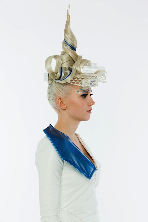 I wanted to create on the front of the head, a mixture between the structure of the roof of the centre Pompidou-Metz and a manta ray because I am a lover of scuba diving. I created a model and the final structure was made by a computer graphics designer and printed in 3D. The different materials used like the white hessian, the wicker chair cover or the maize starch framework result in a very original ensemble. I used glass rod and a crepe paper to stabilize everything.