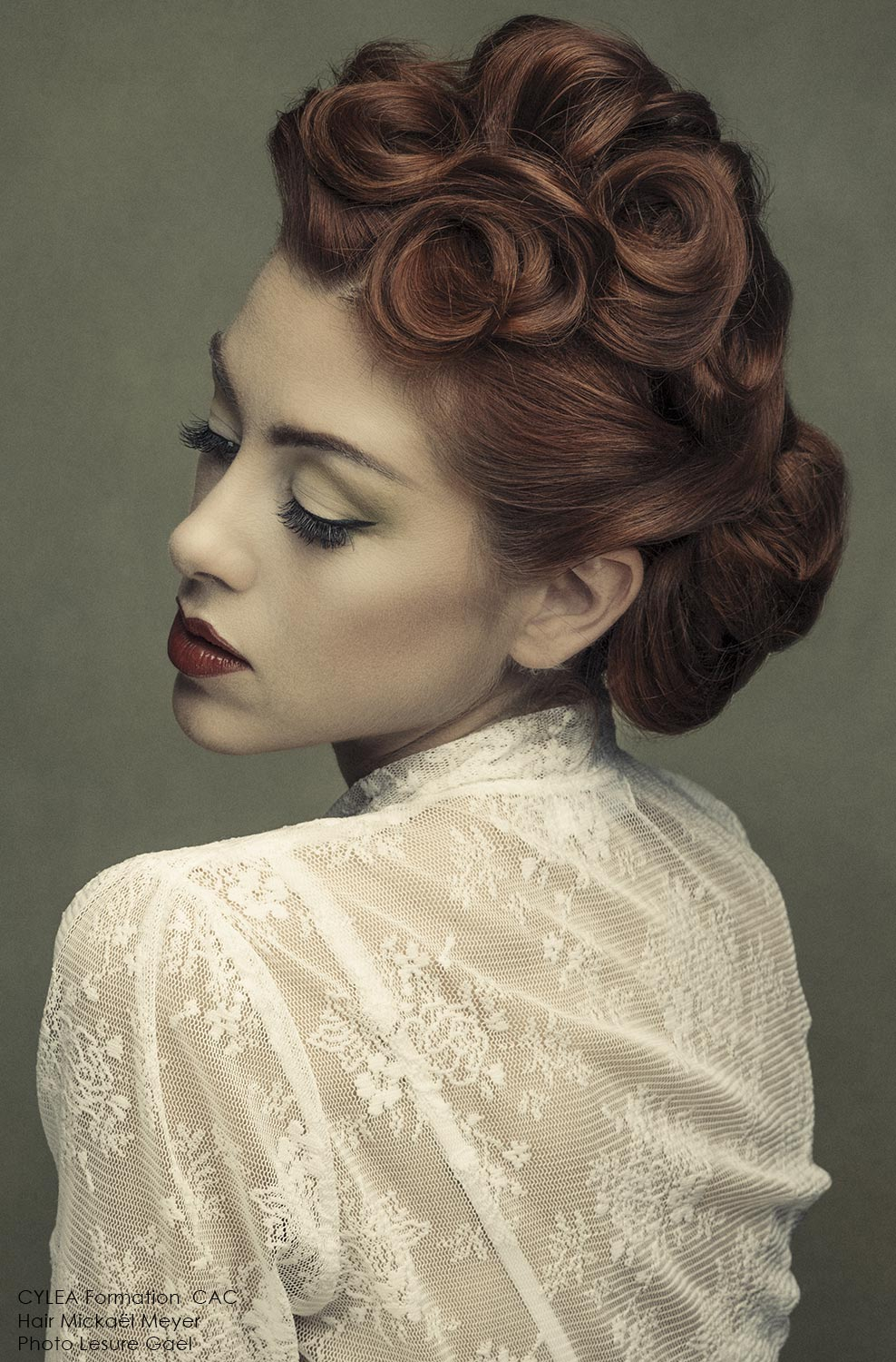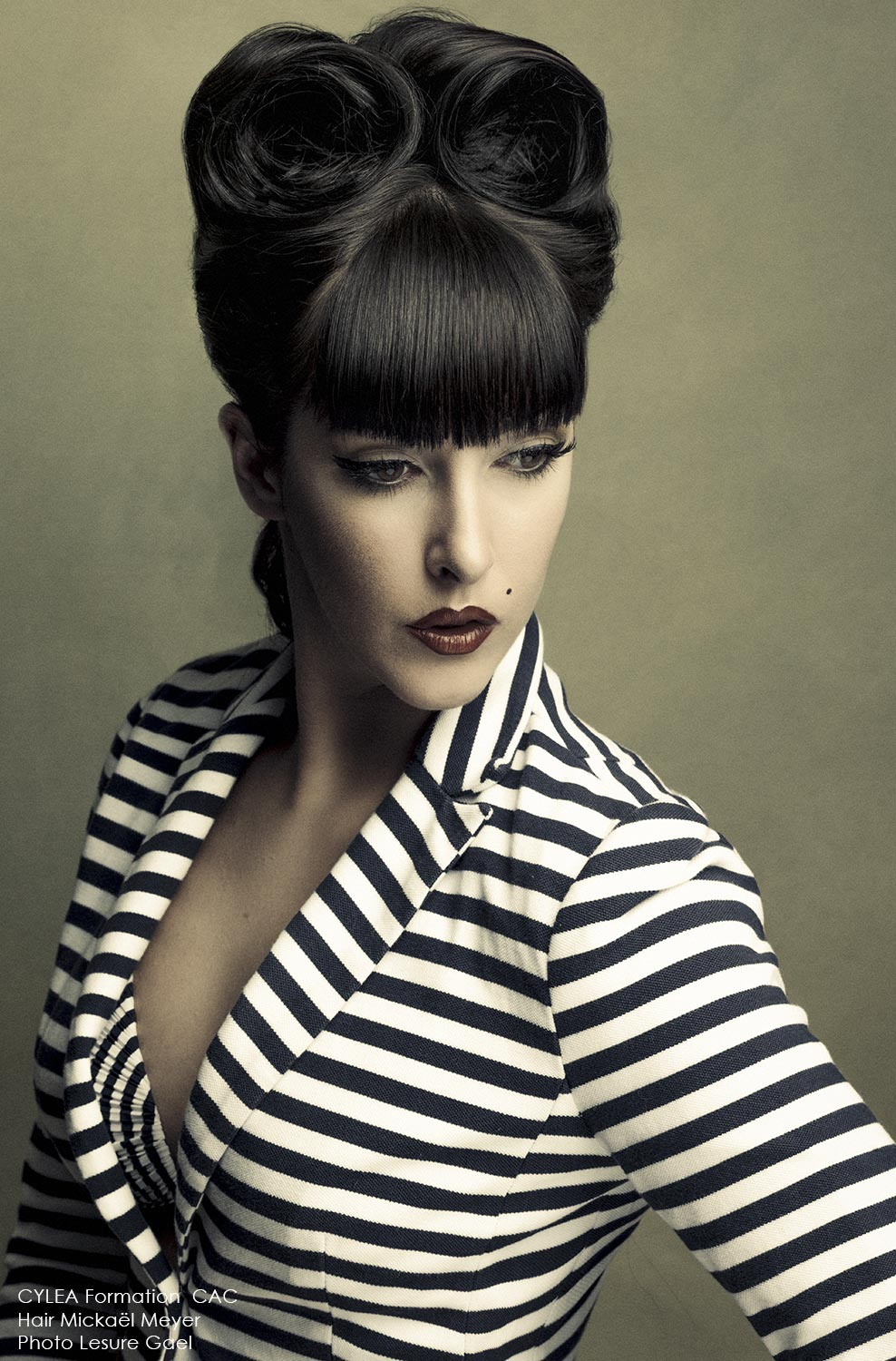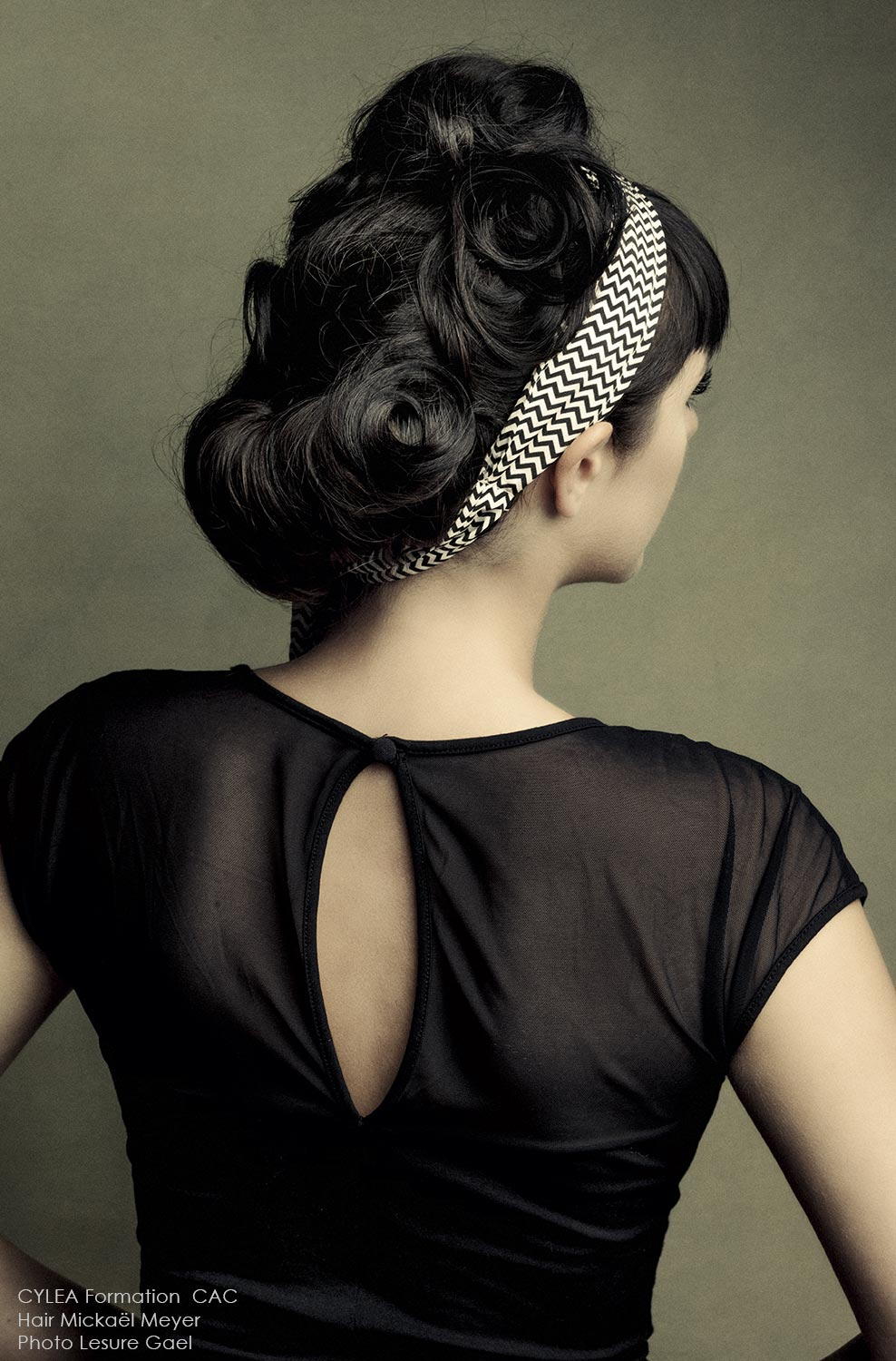 “Mickaël Meyer revisits the vintage buns with his collection called VELVET for Cylea formation by CAC. The reinterpretation of the forties pin-up looks turn the victory roll's into a very graphic style. A very Neo-retro style with Vintage variations which is definitely modern.”