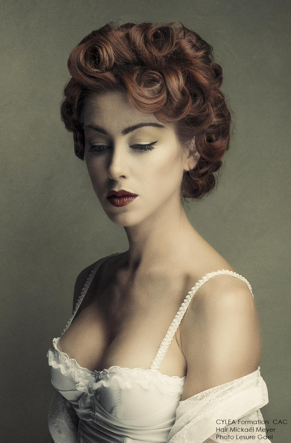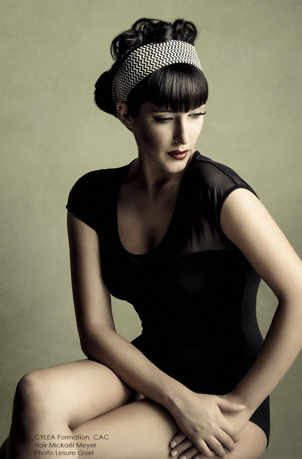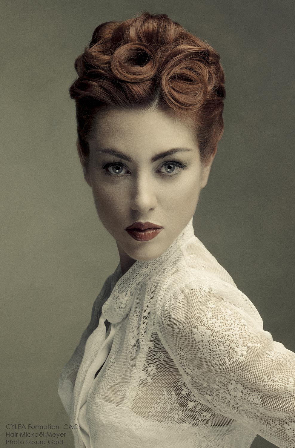 “Mickaël Meyer revisits the vintage buns with his collection called VELVET for Cylea formation by CAC. The reinterpretation of the forties pin-up looks turn the victory roll's into a very graphic style. A very Neo-retro style with Vintage variations which is definitely modern.”