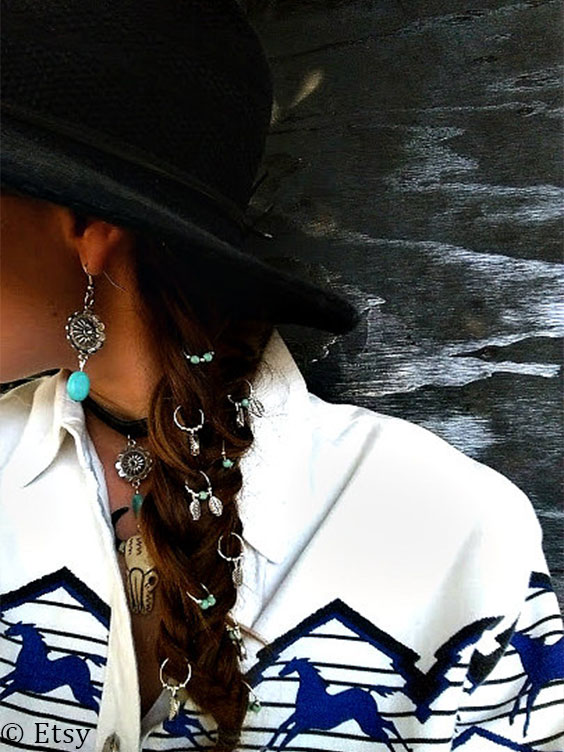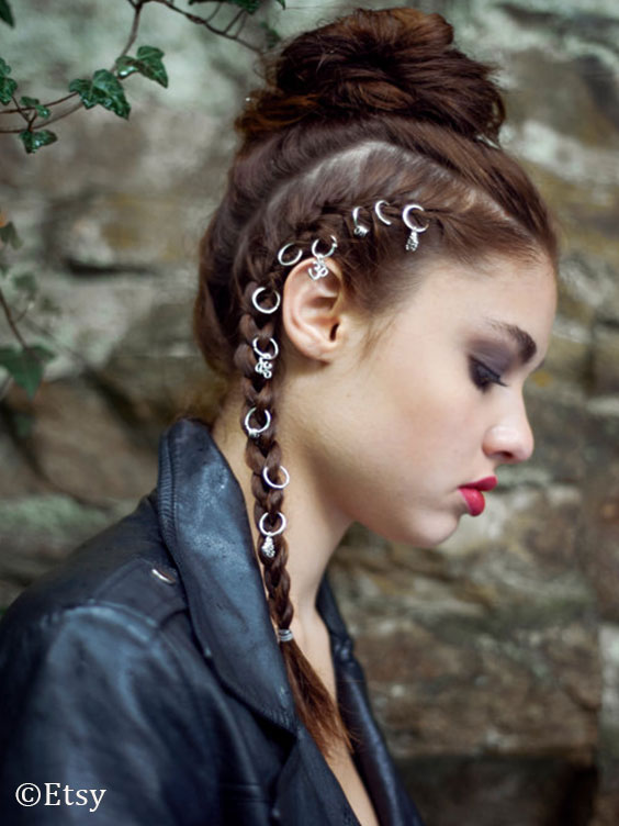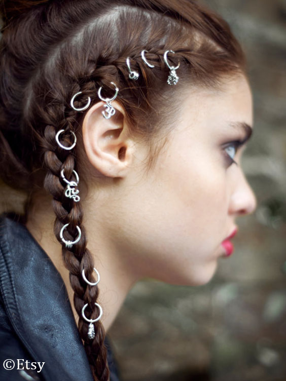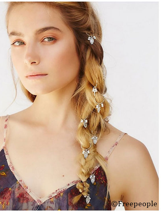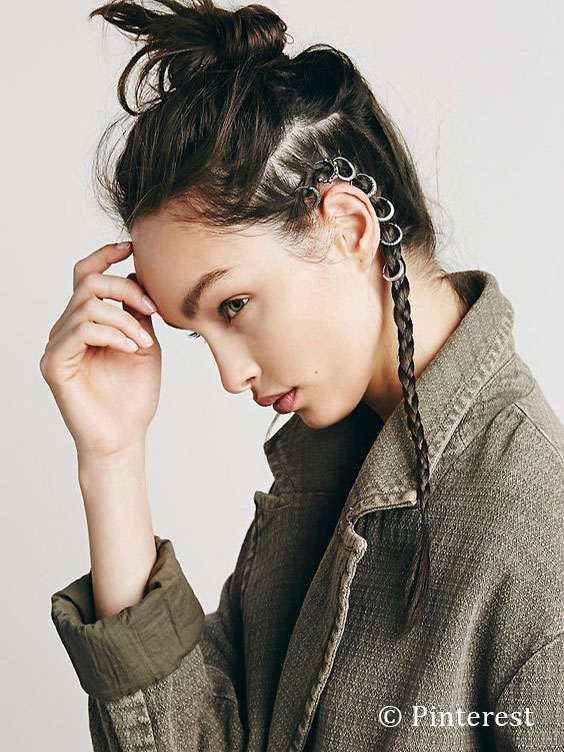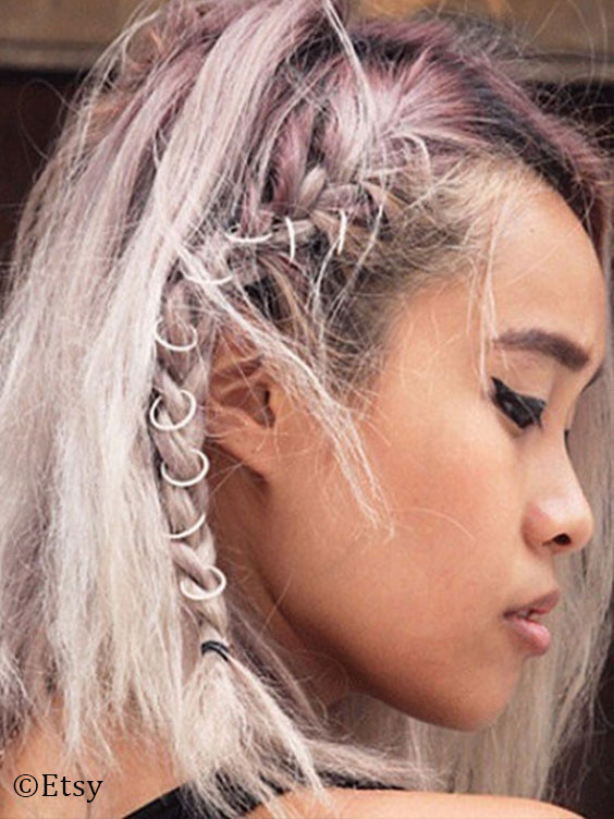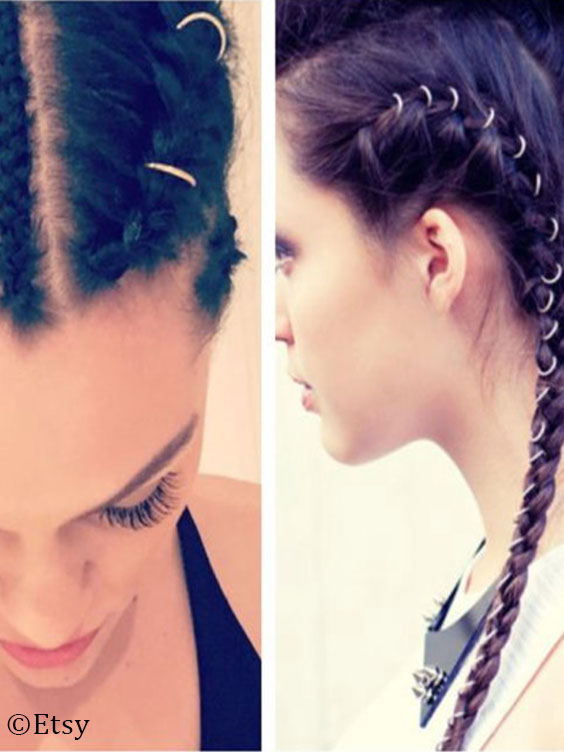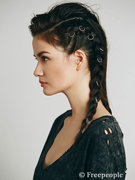 The principle is easy: you just have to make a classic braid or boxer braids, then introduce these little ring in your braid looking like piercings. You can choose to put some all along the strand of just in the end of it. We advise you to use thin rings which will be prettier and more feminine or bigger ones but you may add some feathers or silver charms to obtain a bohemian elegant hairstyle.