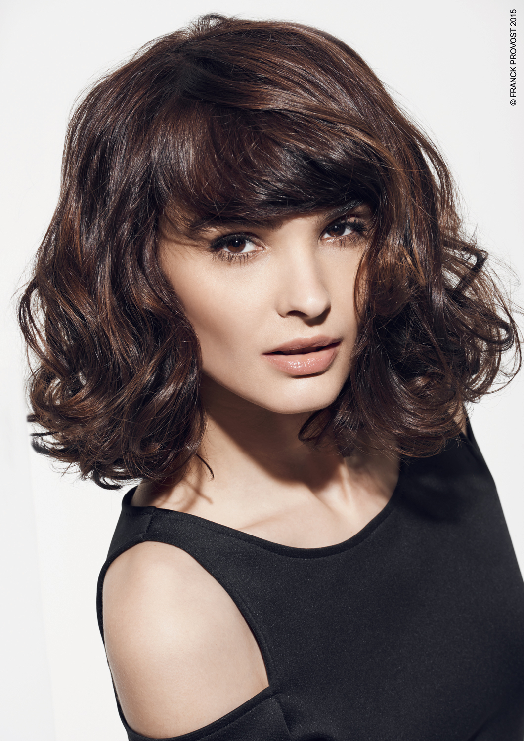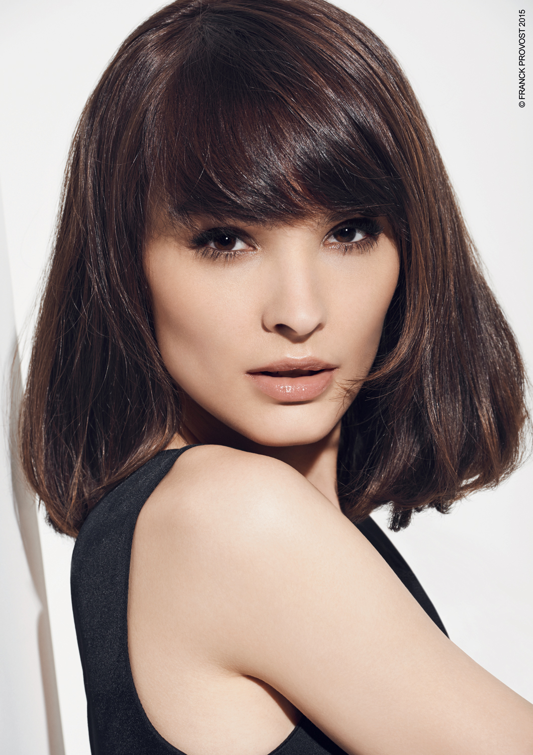The brunette is obviously provocative ! She wears a shoulder bob with a thick fringe. A classic and eternal elegance. The tone is given by a cashmere dark brown color with subtle relief.