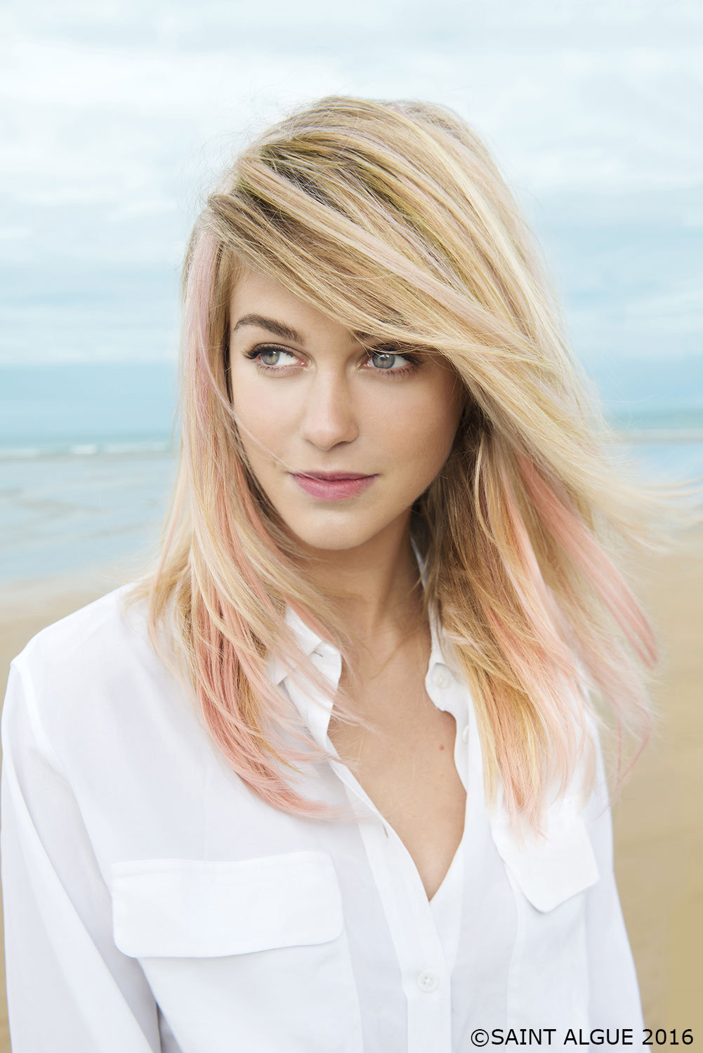 Si quieres algunas mechas discretas para harmonizar tu cabello claro, no dudes en hacer mechas de color pastel en los tonos azul o rosa como lo hizo Saint Algue. Estos tonos en tu cabello te añadirán un toque innovador a un peinado clásico.