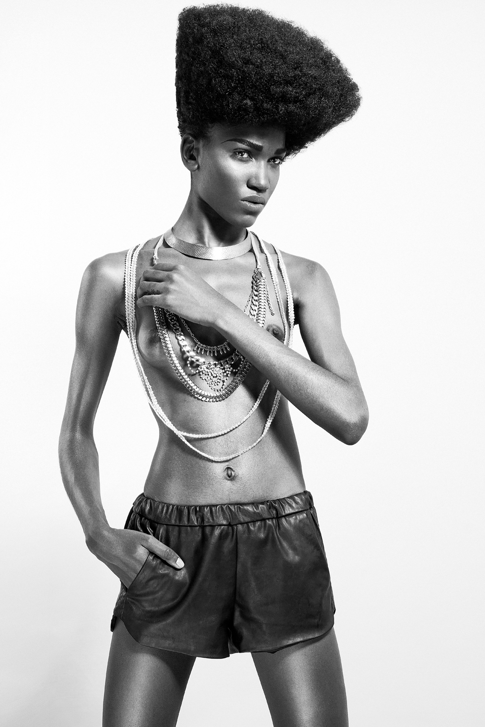 Para la categoría afro, quería obtener algo totalmente diferente, con un plan muy americano, quería realmente ver toda la siluetan que la mujer aparezca como una diosa afro. El peinado tiene mucho volumen, he jugado con la geometría.