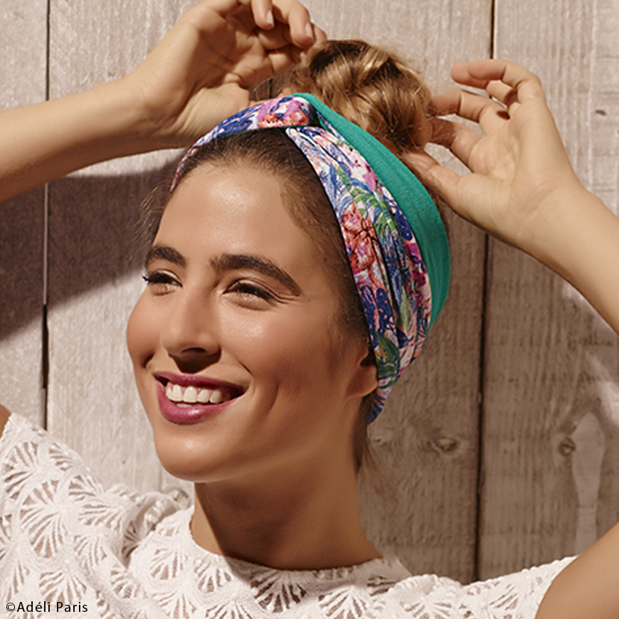 Chez Adeli Paris on ne résiste pas au bandeau fleuri et vert émeraude esprit turban années 30… Le petit plus ? Le turban est réversible – et il vous sauvera plus d’un bad hair day…