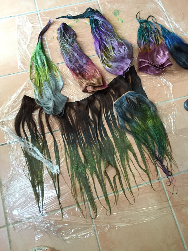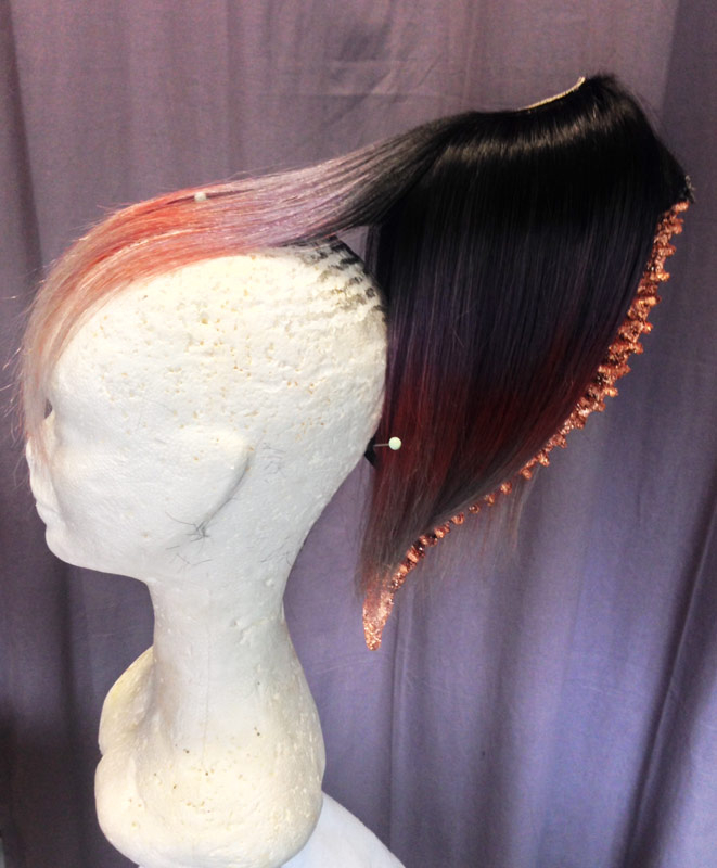 Bien sûr les amis je vous suis ! Et la deuxième création ? LG : là j’ai souhaité pour cette coiffure, au volume positionné sur l’avant visage, exprimer un mélange de matière avec une opposition de cheveux laineux et lisses. Les extensions sont ici cousues sur un bonnet…