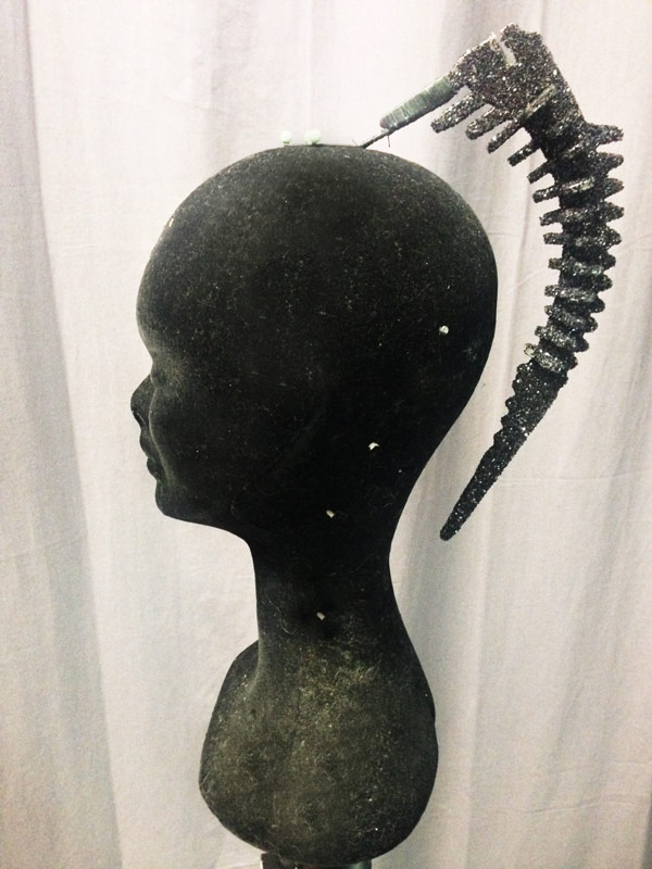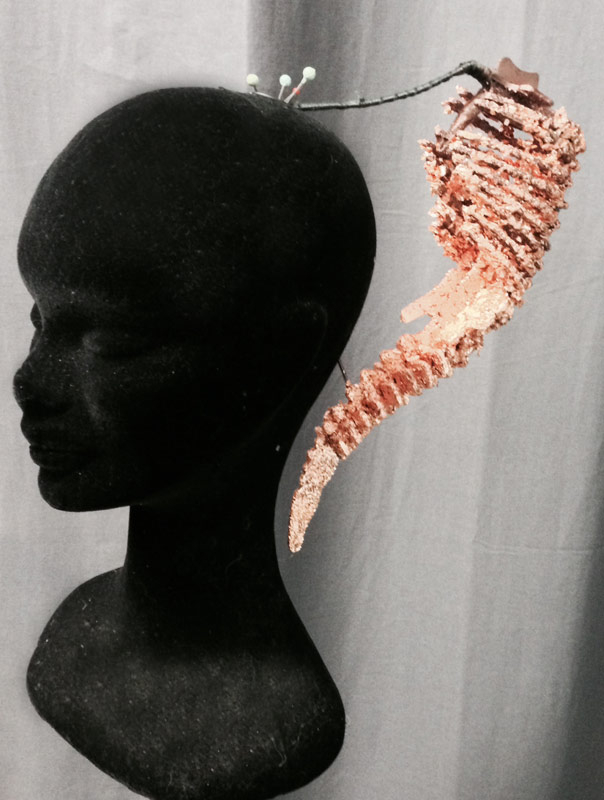 Et pour votre chapeau boubou Laetitia, comment avez-vous procédé ? Justement c’est pour cette création que j’ai d’abord travaillé une forme de crâne surdimensionné en cheveux. Ceux que j’ai mis au four (RIRES)… allez je vous dis tout : une tonne de gel fix max + du spray fix design et 15 minutes à 180 degrés. J’ai ensuite préparé sur du tulle trois mètres d’extensions qui se posent sur le crâne de cheveux. Et pour la touche finale j’ai ajouté la structure de Christophe pour le côté « vertébrés » et continuité de la colonne en mode 3D. Mais au-delà de cela comme on estime que l’Afrique est le berceau de l’humanité, entre fouilles archéologiques et squelette, vous nous suivez ?