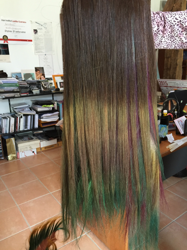 J’ai d’ailleurs préparé mes extensions comme un millefeuille multicolore. Mes volumes et structures sont un clin d’œil au travail très géométrique de Goude. Il m’a fallu douze mètres d’extensions pour y parvenir et quelques nouvelles expériences pour solidifier mes supports entièrement réalisés en cheveux… en les passant au four par exemple !